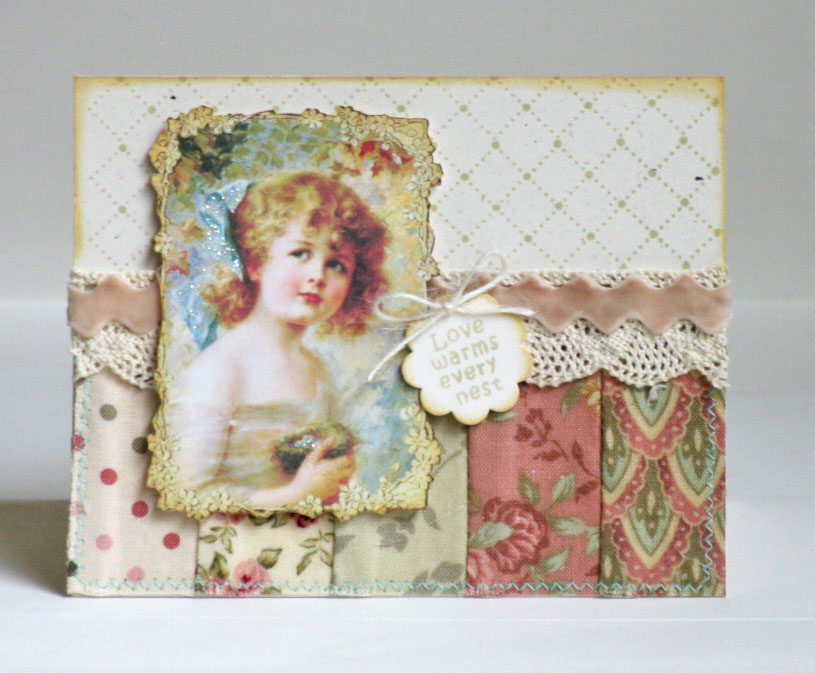 My mom is a quilter and a while back she gave me a sweet little 6x6 sqaure made from 5 lucious fabrics. It was a leftover from a project, and too good to toss. So this was the perfect inspiration for this card. The sweet Crafty Secrets girl image seems to blend with the vintage fabric. The upper part is stamped with Papertrey Ink's BB Tin Types and Old Paper distress ink. The sentiment is from Crafty Secrets Bird Notes.Double click photo for a larger view.